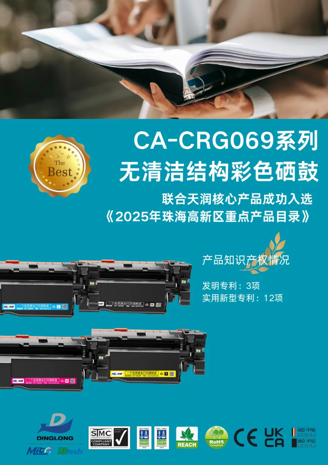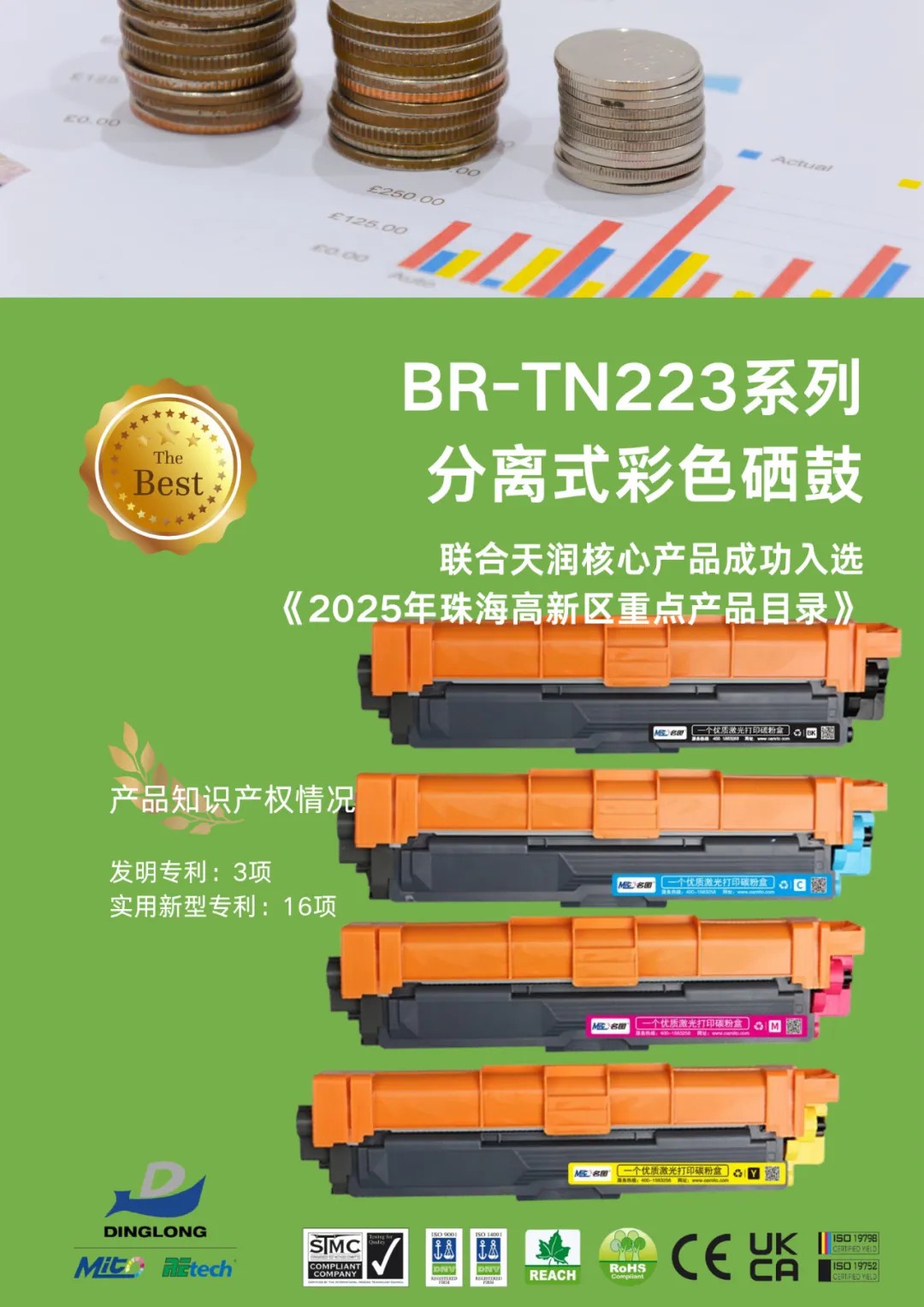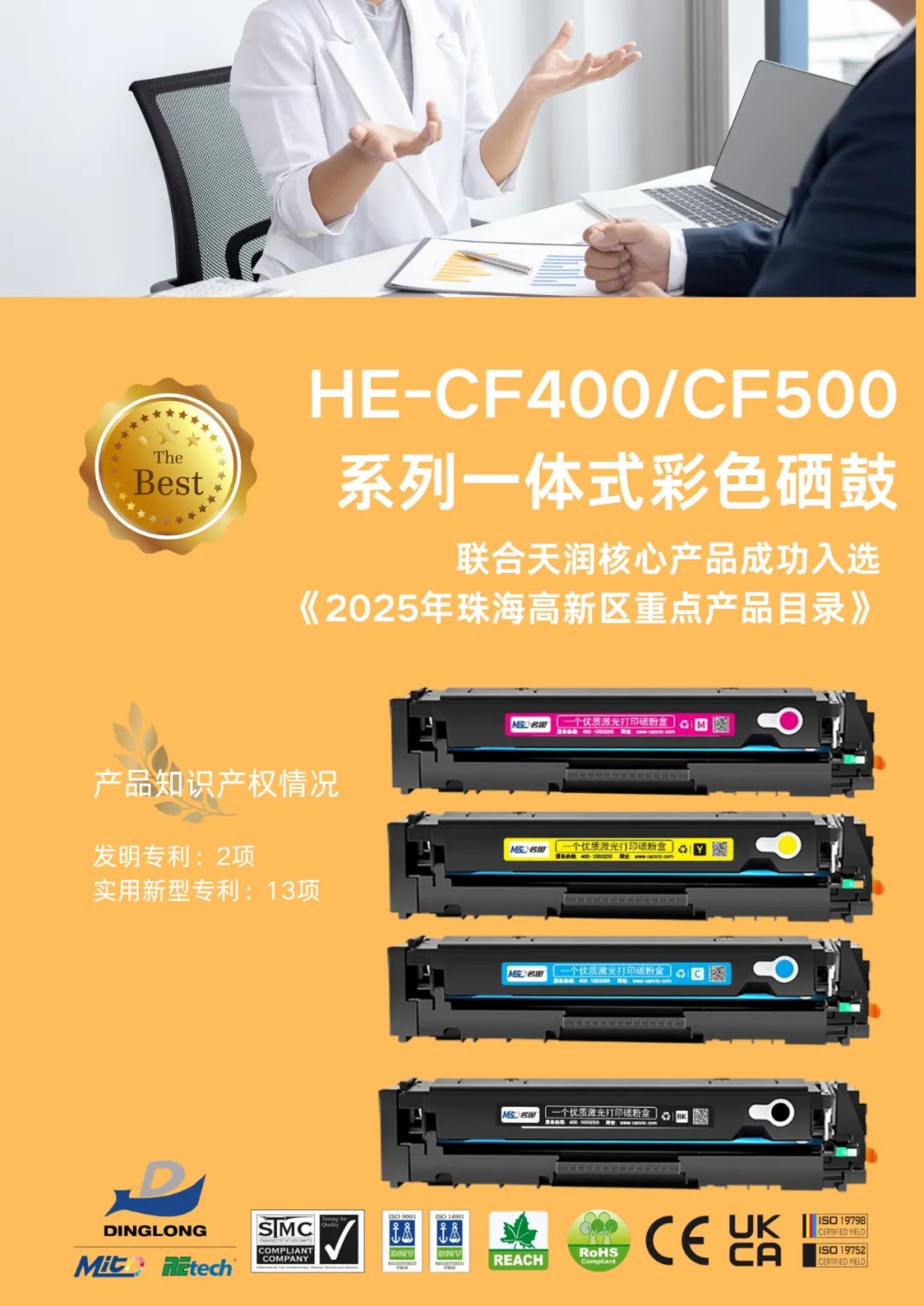 近日,联合天润旗下三款核心产品——HE-CF400/CF500系列一体式彩色硒鼓、BR-TN223系列分离式彩色硒鼓、CA-CRG069系列无清洁结构彩色硒鼓,凭借过硬的技术实力与卓越产品性能,成功入选《2025年珠海高新区重点产品目录》。